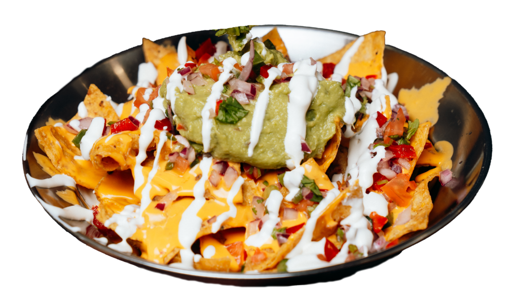 Totopos caseros, queso cheddar, guacamole, carne boloñesa, jalapeños, pico de gallos, nata agría y queso cheddar líquido.
