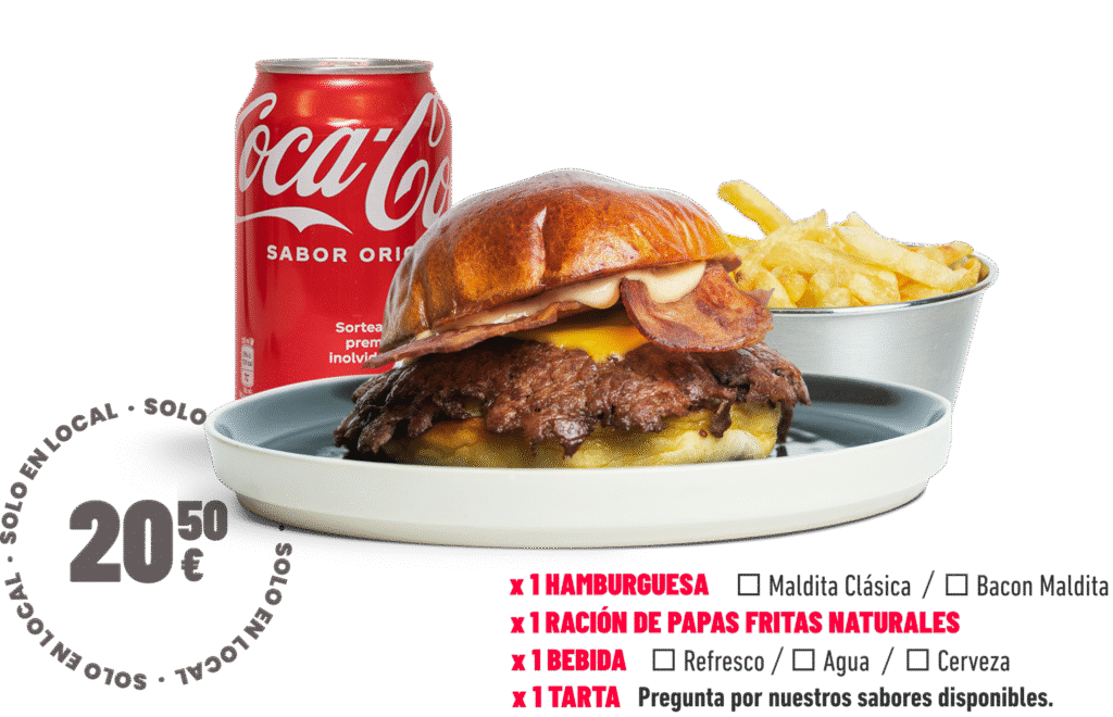 Pan potato, doble patty de carne dry aged (180gr), doble queso cheddar madurado, doble bacon crujiente, pepinillos, salsa maldita (no picante).