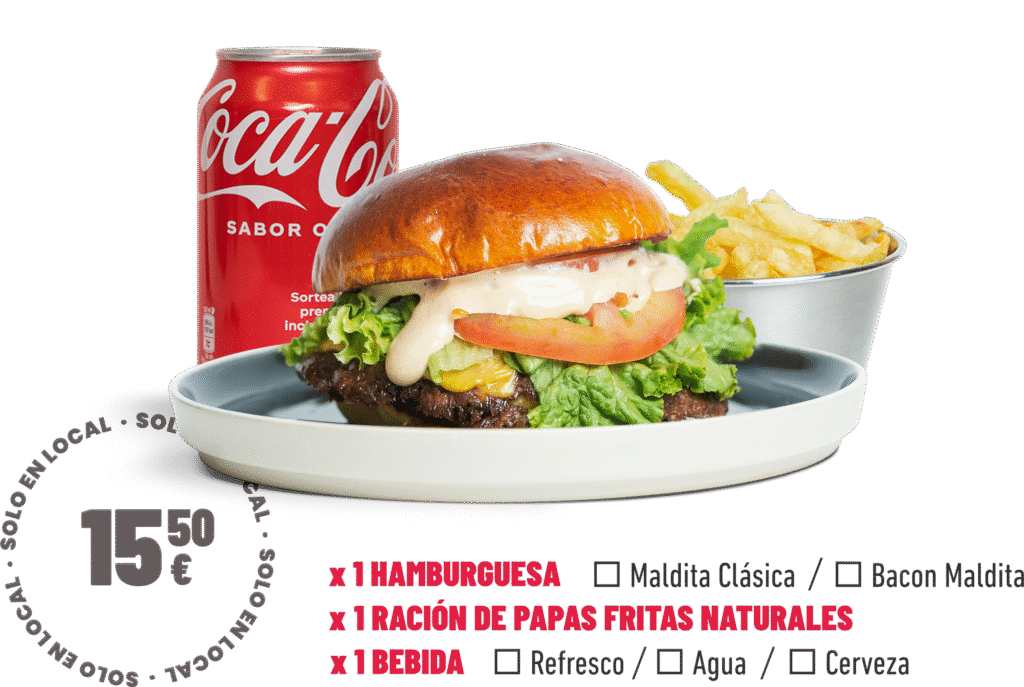 Pan potato, lechuga, tomate, doble patty de carne dry aged (180gr), doble queso cheddar madurado, salsa maldita (no picante).