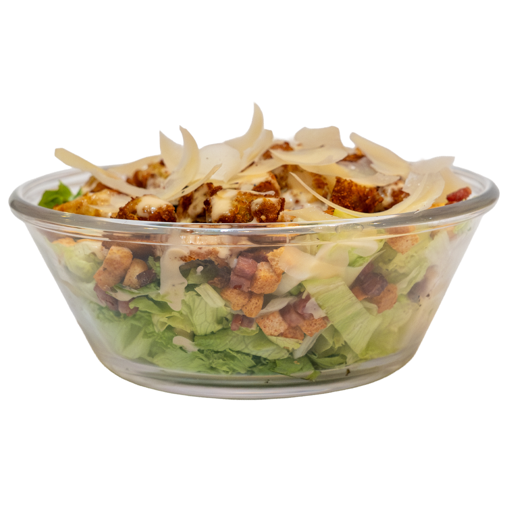 Mix de lechugas, picatostes, lascas de parmesano, bacon bits, tiras de bacon, pollo crujiente y salsa césar