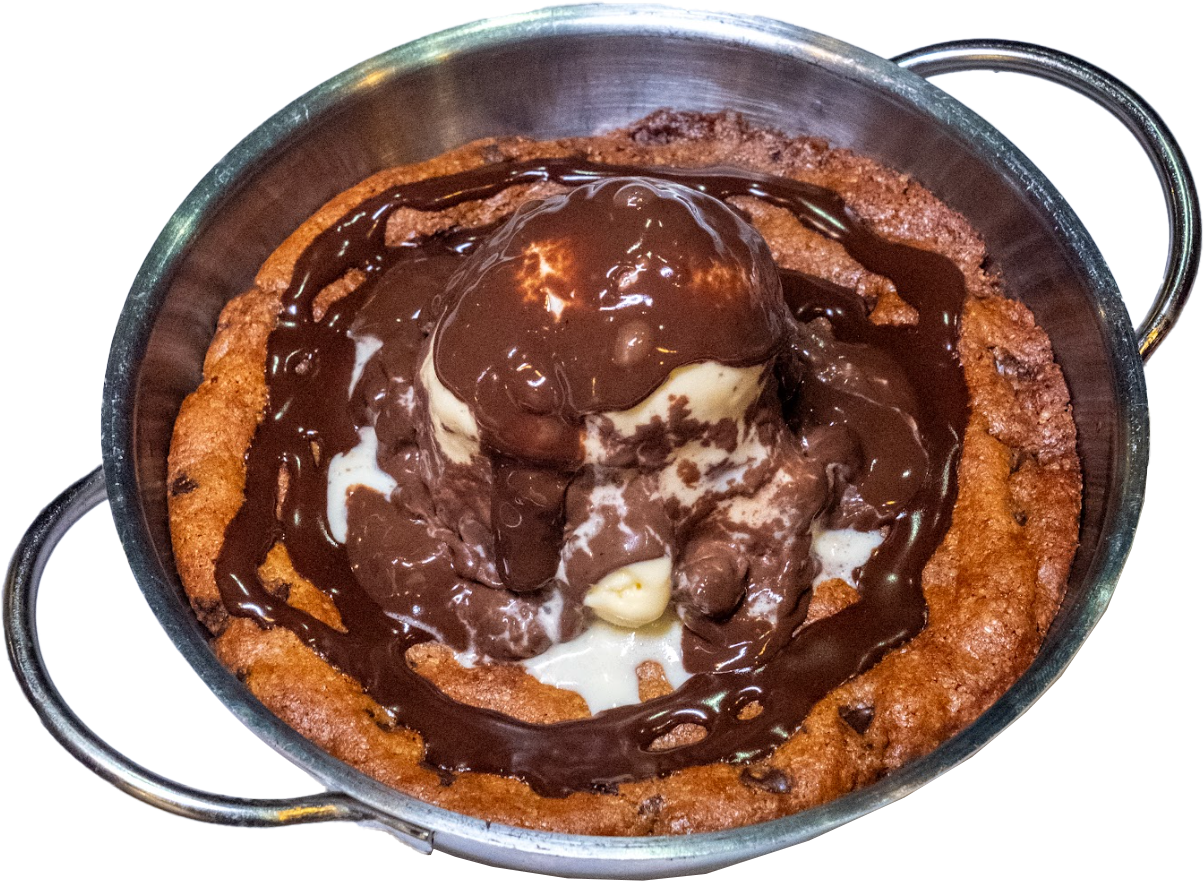 Al estilo americano con pepitas de chocolate, helado de vainilla y chocolate caliente. Preparación de 15 min, pedir con antelación.