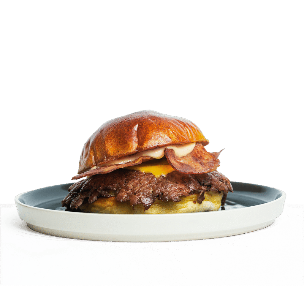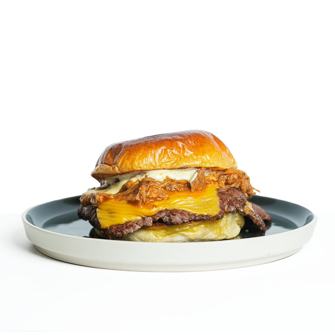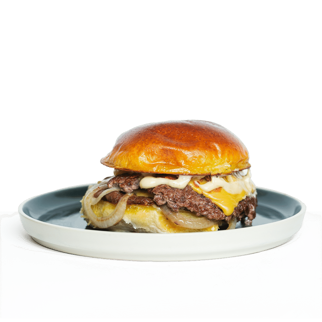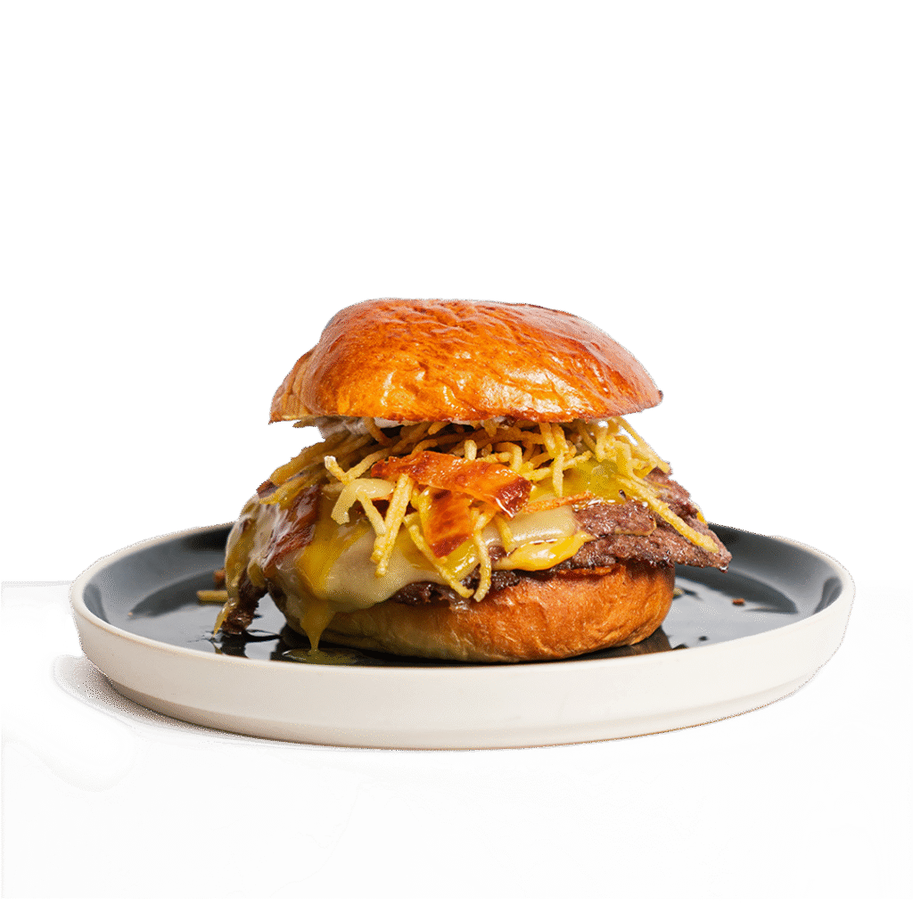 Pan potato, doble de carne smash, queso ahumado, queso chedda, cebilla frita natural y salsa de reducción de carne.