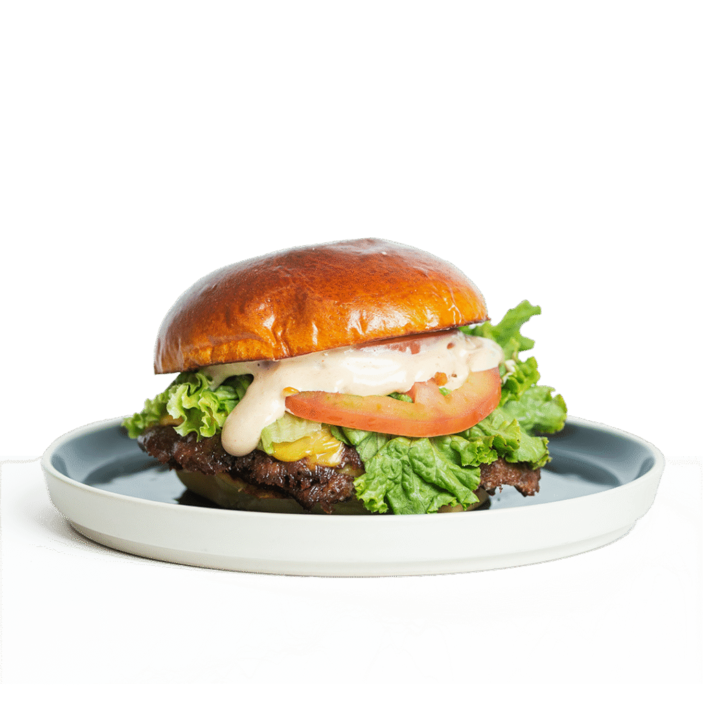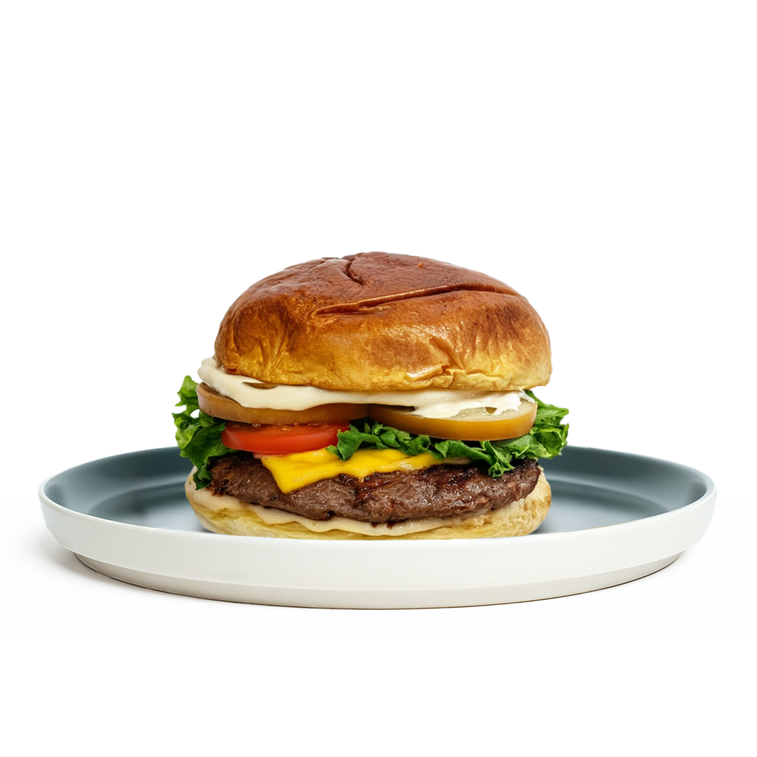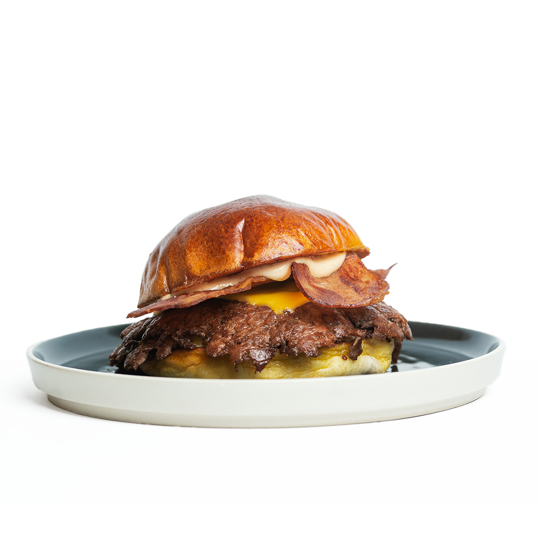 Pan potato, doble de carne smash, queso ahumado, queso chedda, cebilla frita natural y salsa de reducción de carne.