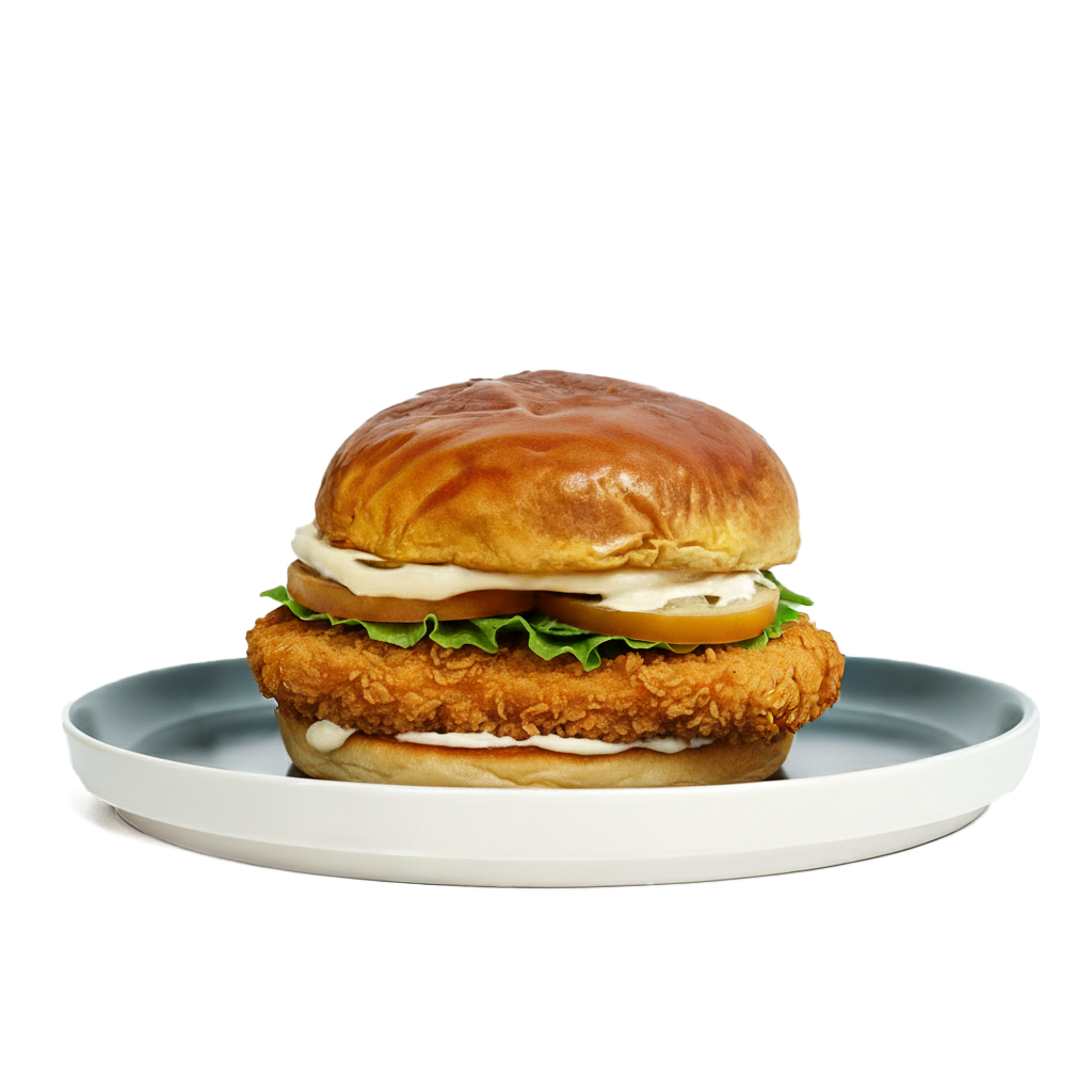 Pan potato, pollo rebozado estilo kentucky, bacon, lechuga, tomate y mayonesa.